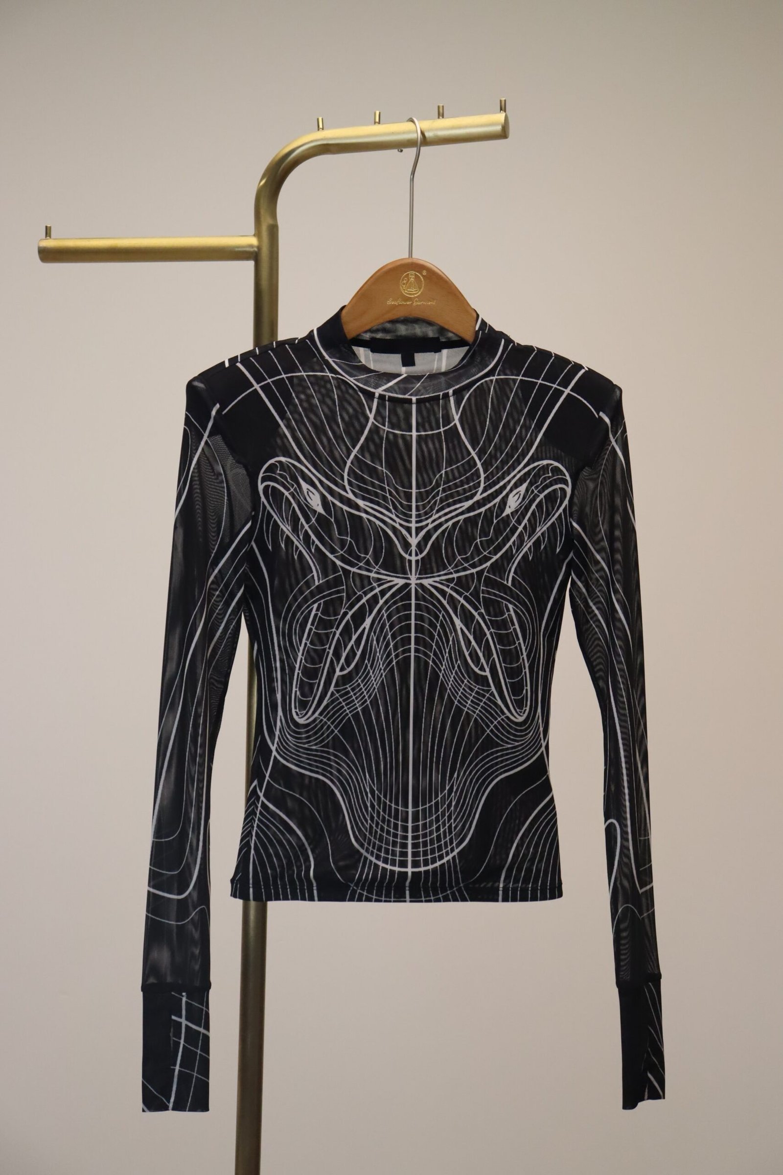 | Design Format | Black and white line mesh print design, fitted long-sleeve style, customizable (Logo, print, details available) |