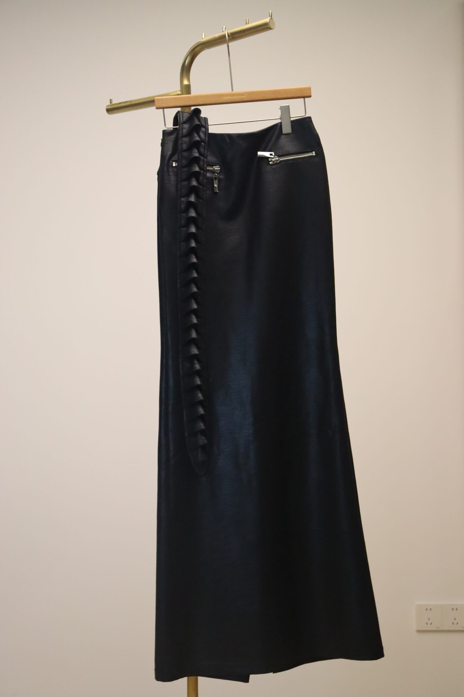 Product Name Black Leather Long Skirt with Back Spine Design