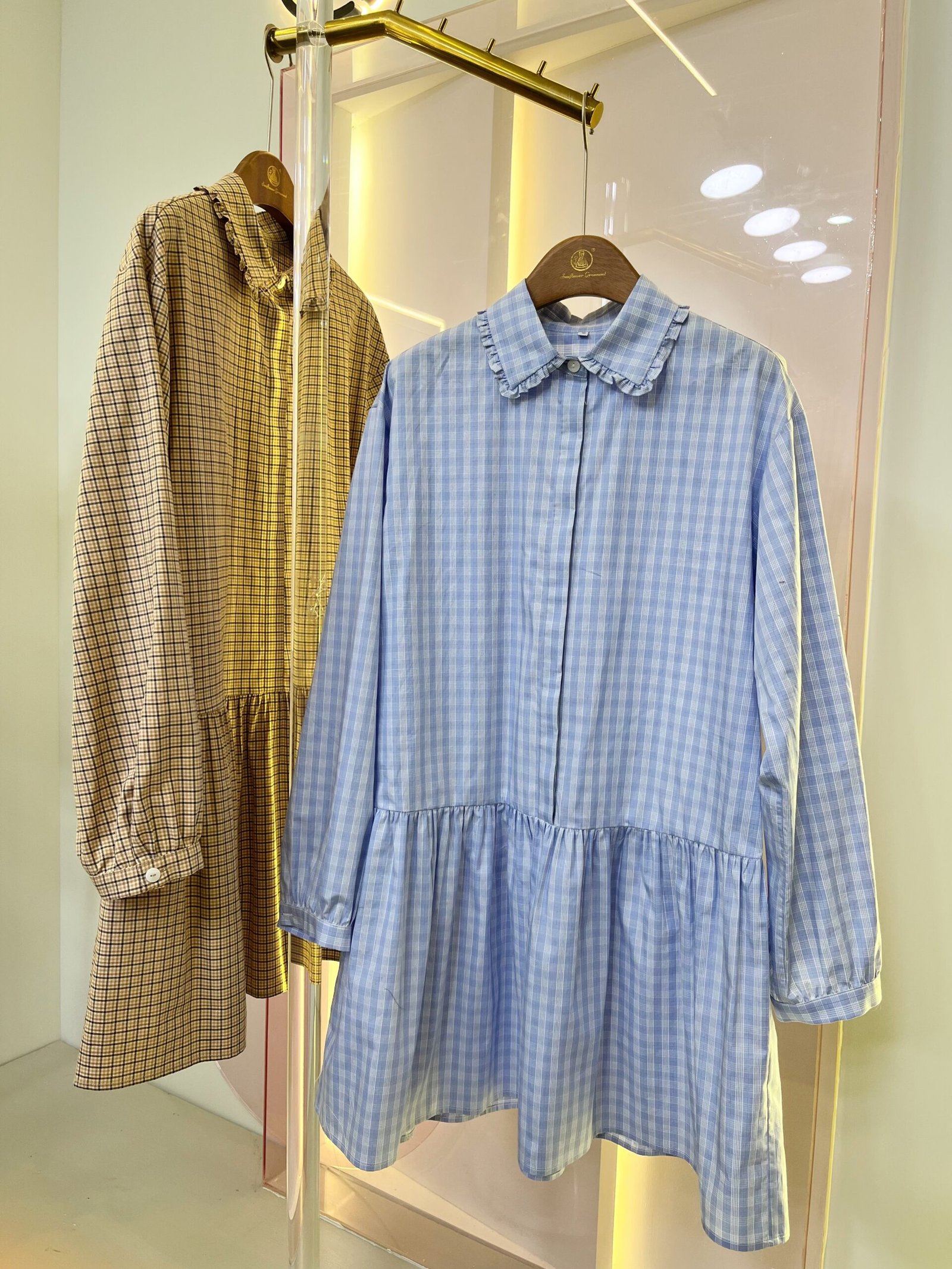 | Design Format | Checkered pattern, ruffled collar, long sleeves with cuff design, pleated skirt hem |