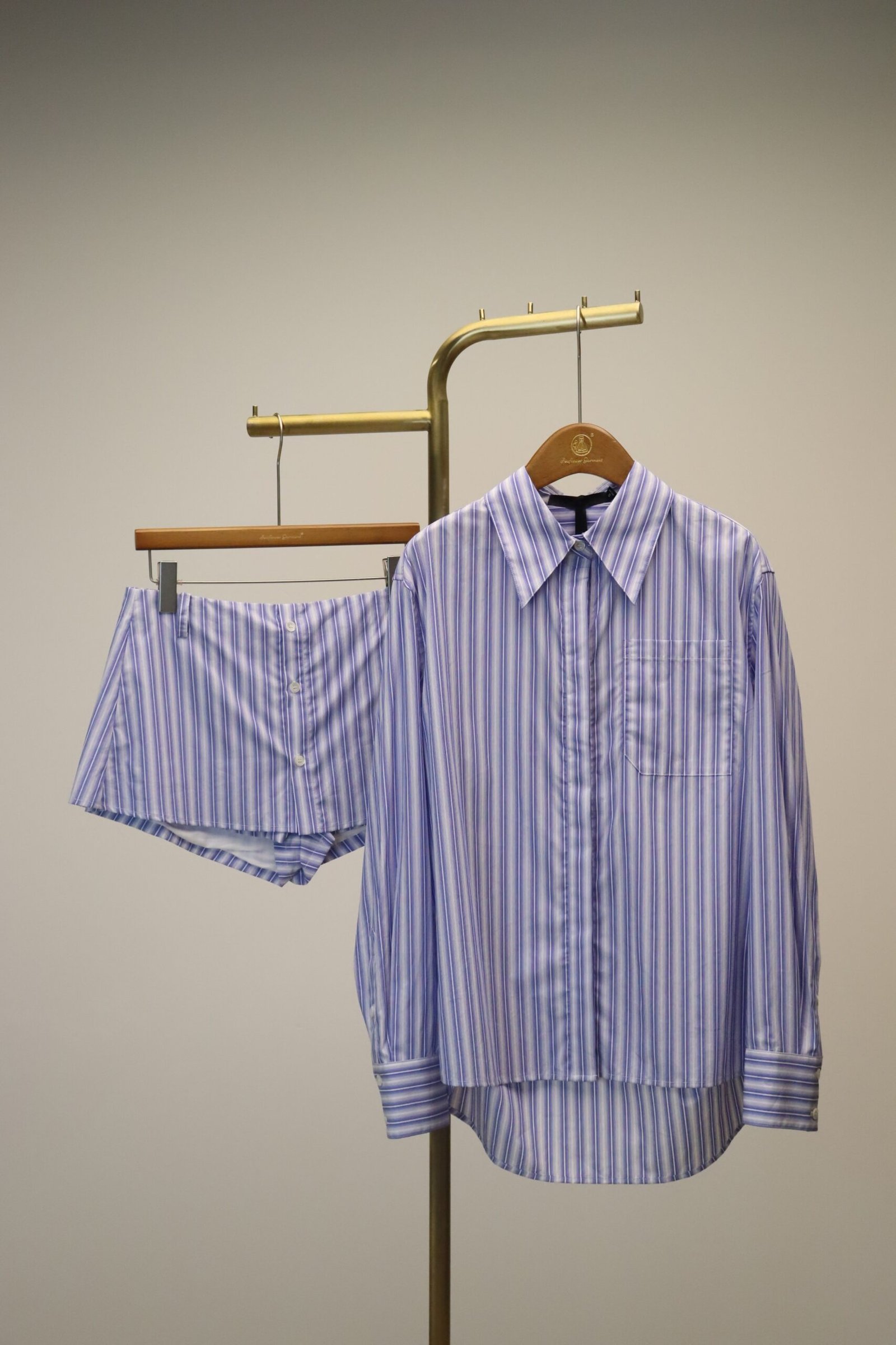 Blue-and-white striped set: loose long-sleeve shirt with matching shorts. Creates a casual office vibe, fitting daily outings, light office scenes for easy style switching.