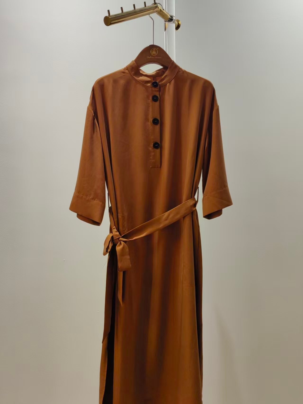 New Chinese Style, stand collar, half-placket button closure, elbow-length sleeves, side slits, matching self-tie belt, relaxed A-line silhouette.