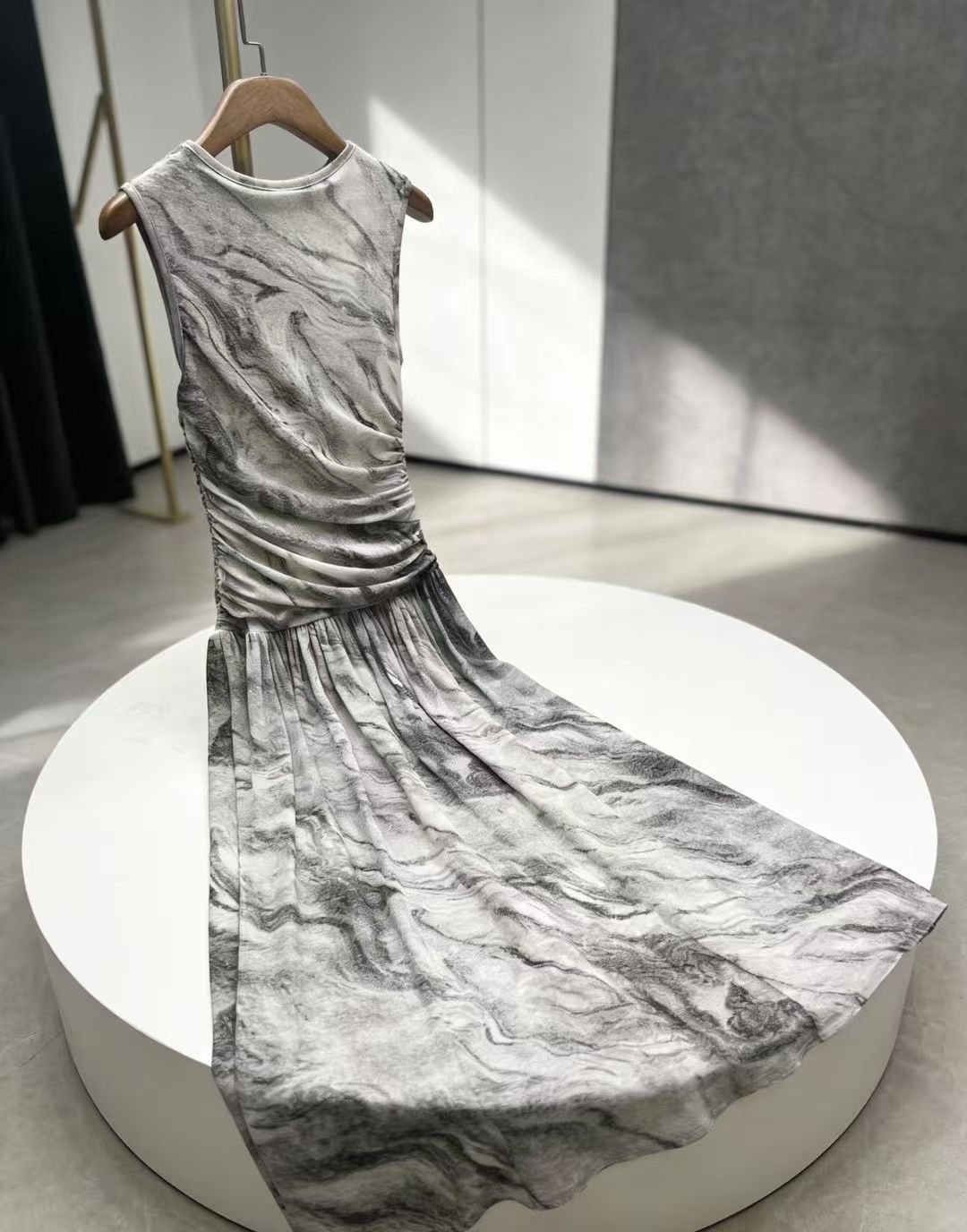 | Product Name | Sleeveless Waist-Cinching Marble-Print Long Dress |