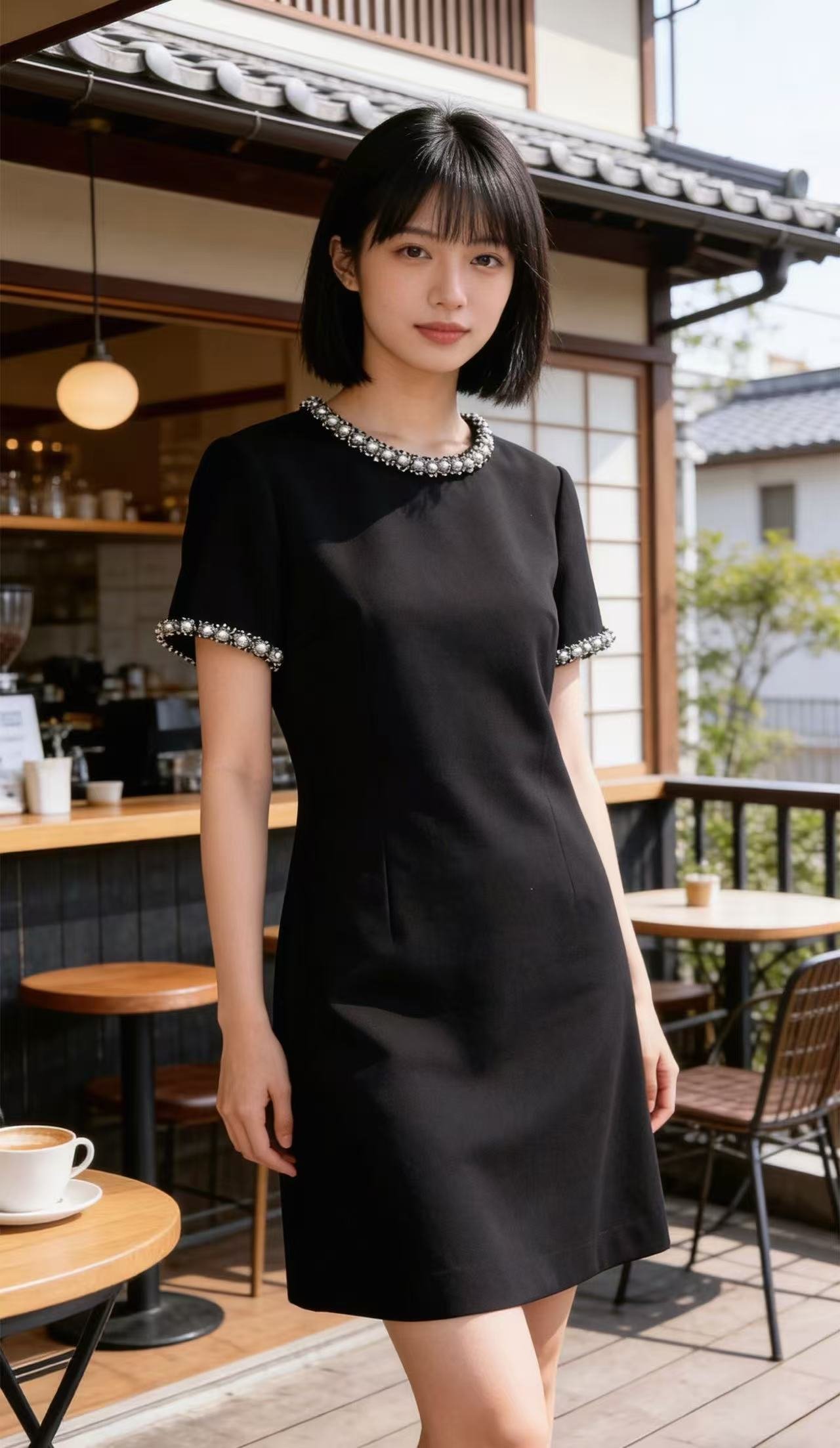 | Design Format | Solid black short-sleeve crew-neck dress, relaxed straight fit; pearl and rhinestone accents on neckline and cuffs; minimalist silhouette with delicate details, suitable for work/semi-formal occasions. |
