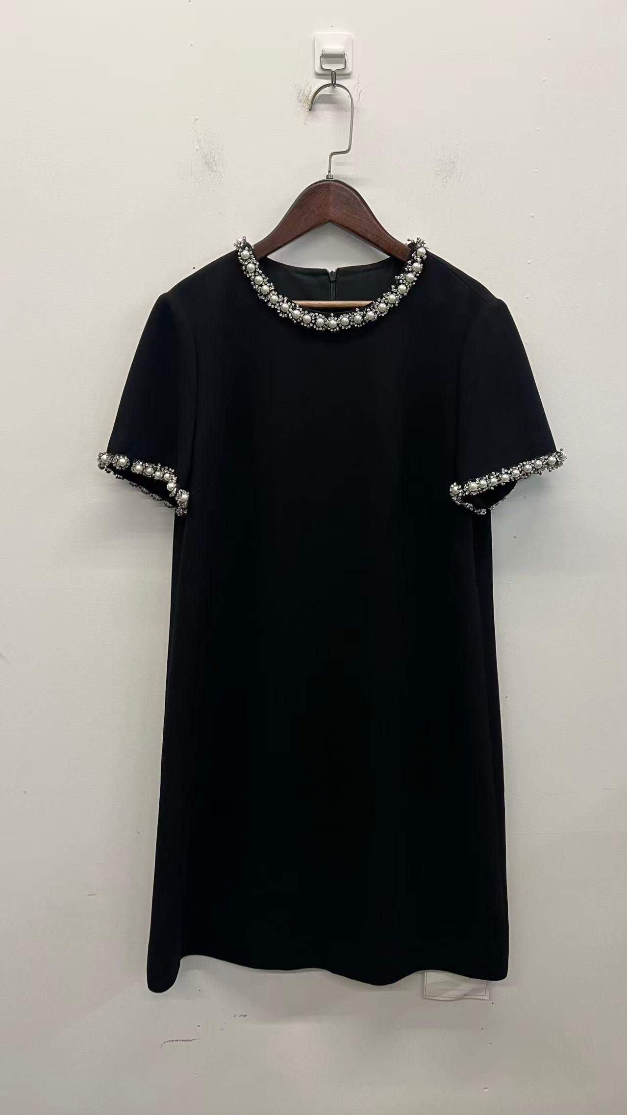 | Design Format | Solid black short-sleeve crew-neck dress, relaxed straight fit; pearl and rhinestone accents on neckline and cuffs; minimalist silhouette with delicate details, suitable for work/semi-formal occasions. |