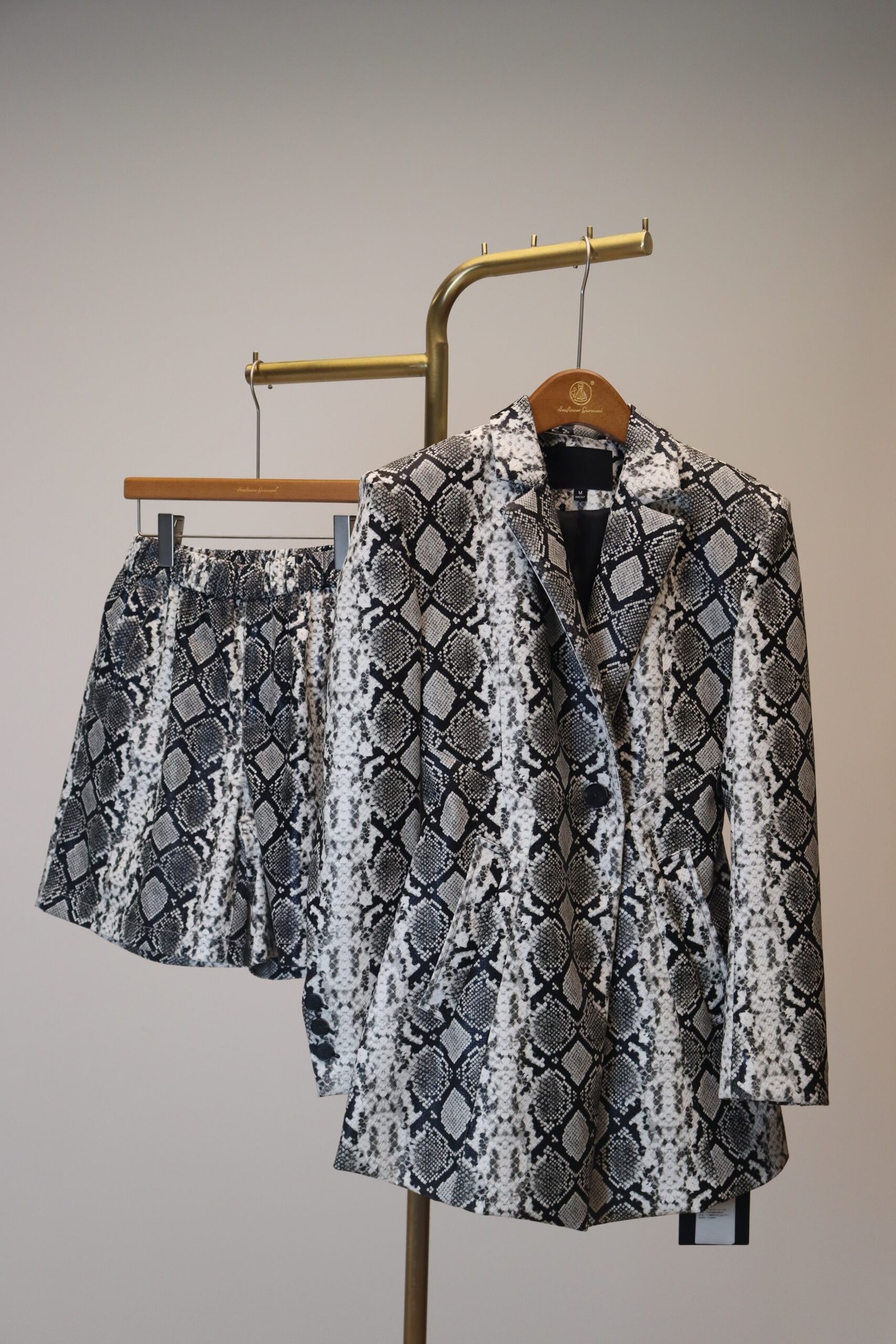 This snake-patterned PU set has a sleek blazer and loose shorts. Edgy, eye-catching style highlights personal fashion vibes.