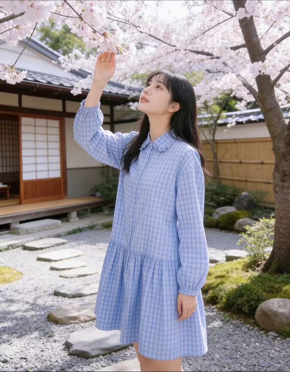 This blue-and-white checkered shirtdress features a ruffled collar and a loose A-line silhouette that flatters the figure by hiding unwanted bulk. The fresh checkered pattern exudes an artistic vibe, and the breathable, skin-friendly fabric makes it a versatile choice for daily casual wear and soft artistic styles.