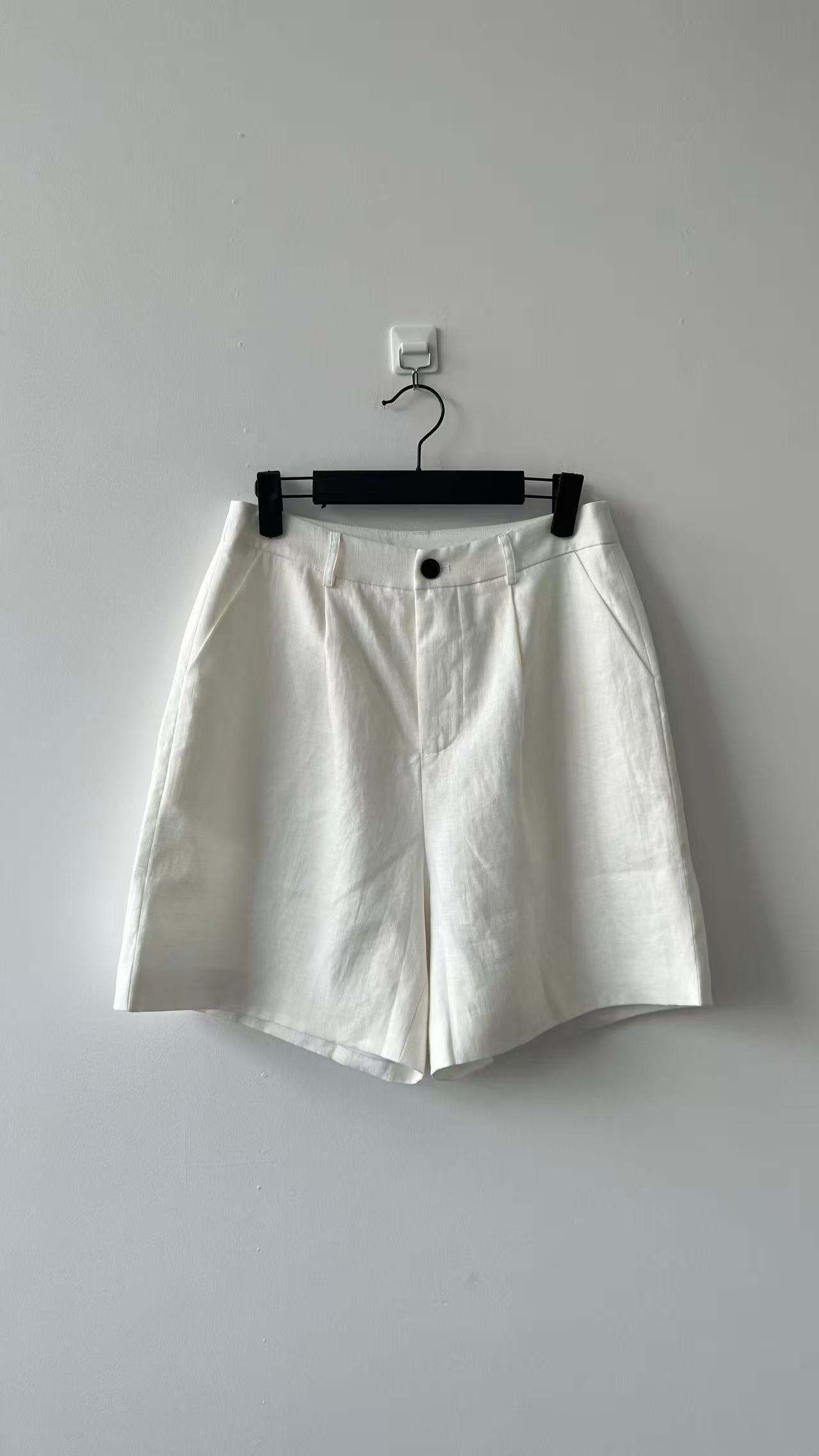 Crafted from **100% pure linen**, these shorts feature a minimalist solid white colorway, paired with a high-waisted + subtle pleat design—blending breathable comfort with sleek casual style. The natural linen texture is perfect for spring and summer; the wide-leg fit flatters leg lines while ensuring freedom of movement, making them a fresh styling staple for daily commutes and leisure outings.