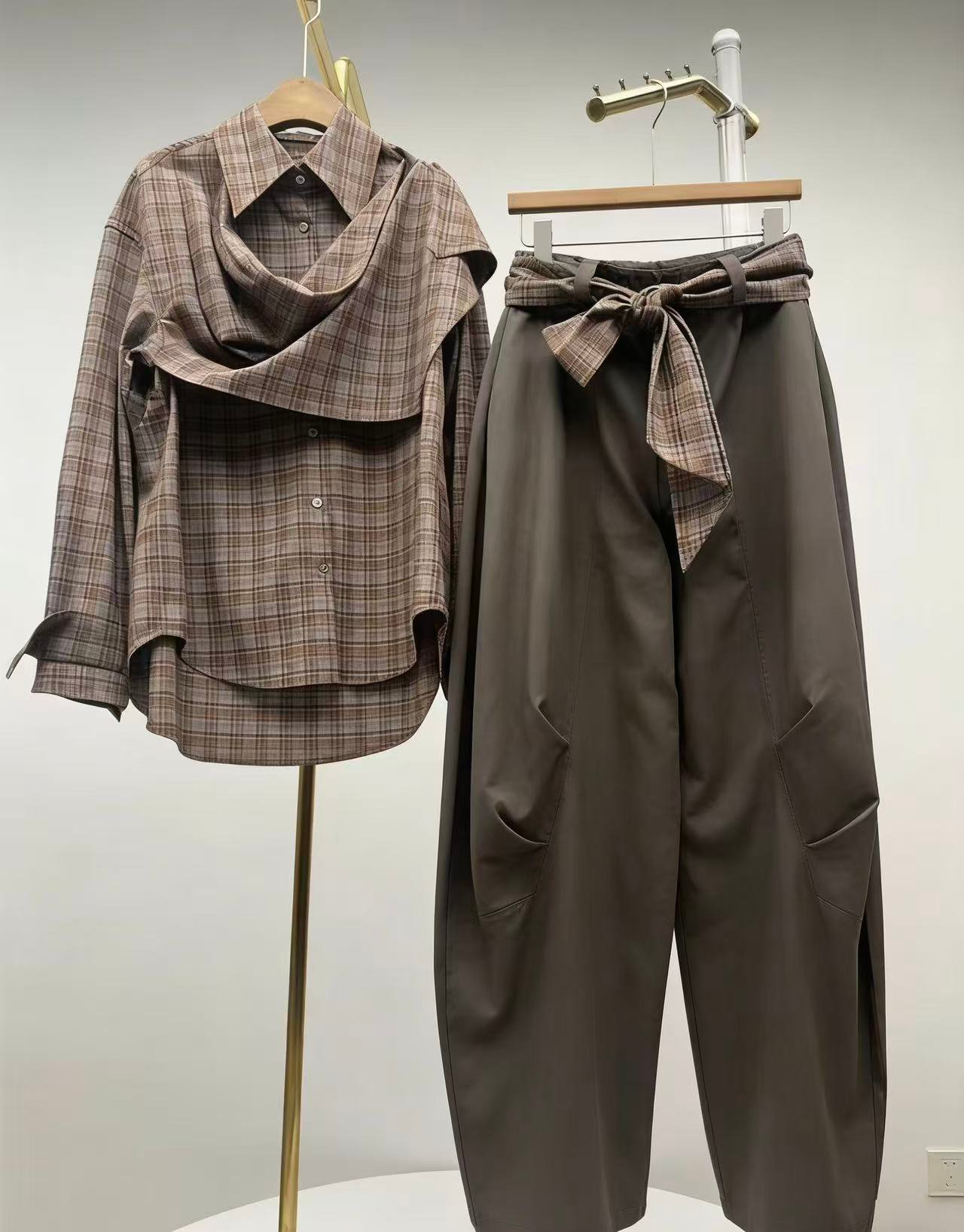 | Design Format | Japanese-inspired minimalist style; Shirt features a draped cowl neck, warm brown checkered pattern, and irregular hem; Pants feature a high-waisted tapered cut with a matching checkered belt and ankle slits. |