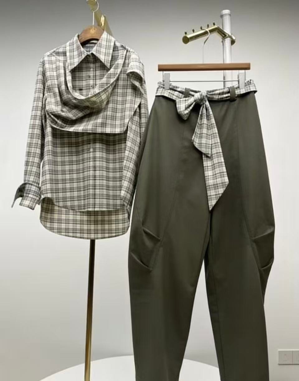 | Design Format | Japanese-inspired minimalist style; Shirt features a draped cowl neck, classic checkered pattern, and irregular hem; Pants feature a high-waisted tapered cut with a matching checkered belt. |